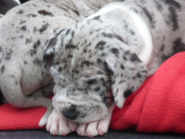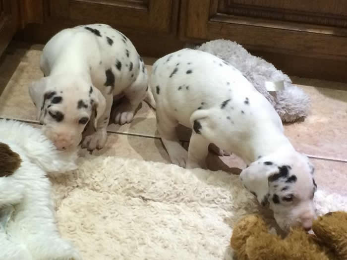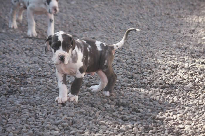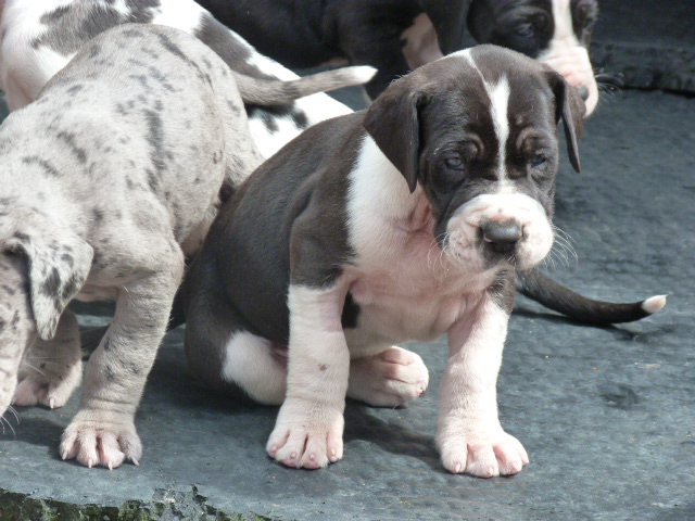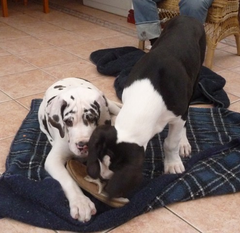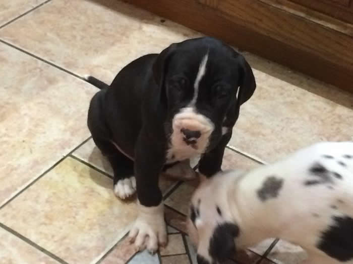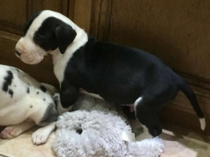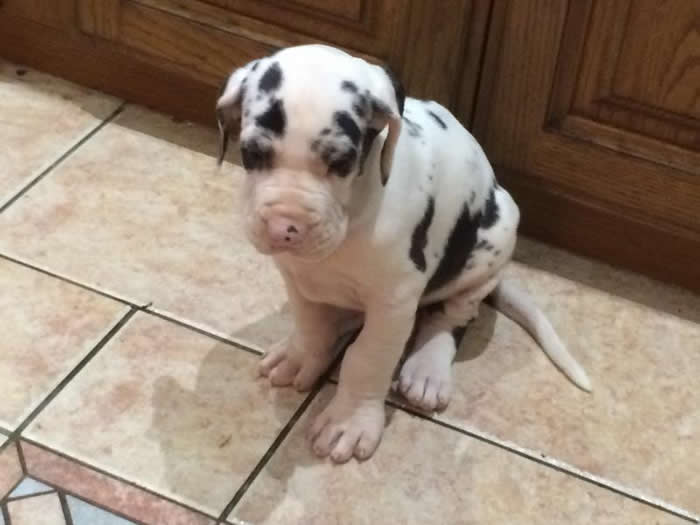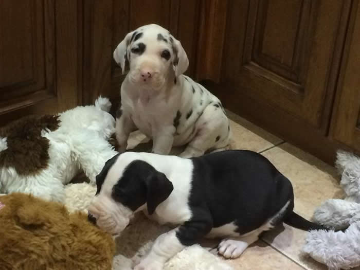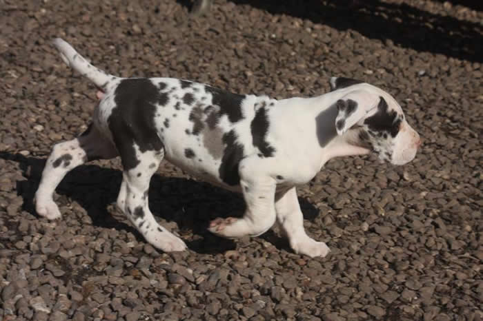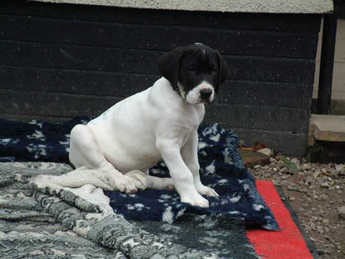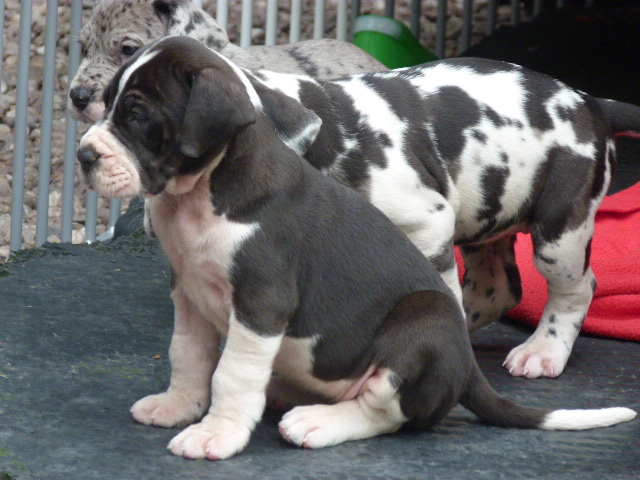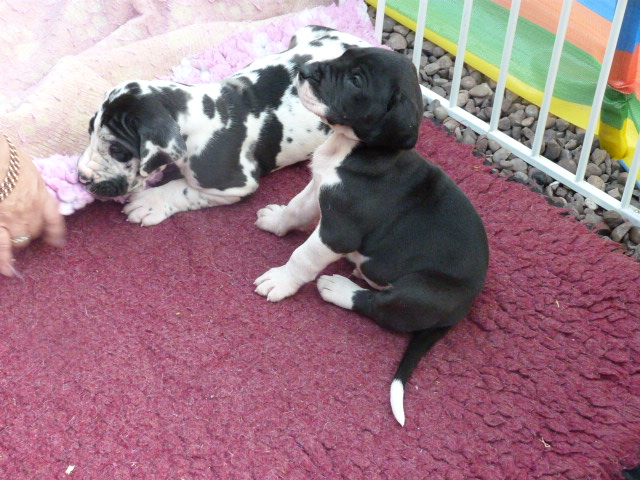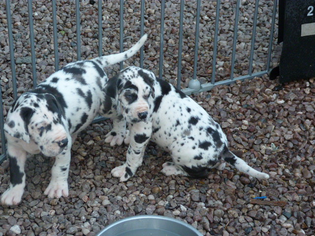 at 12 weeks old (shown here with a pretty 9 week old harlequin girl sired by Ravendane Pole Position - Bob)