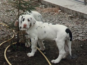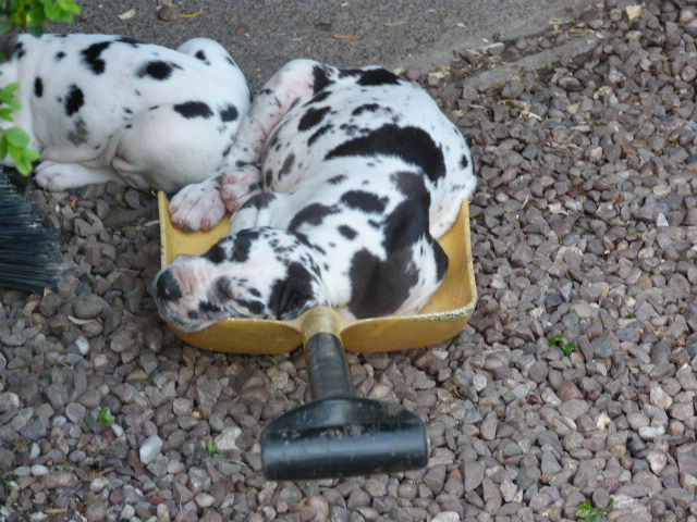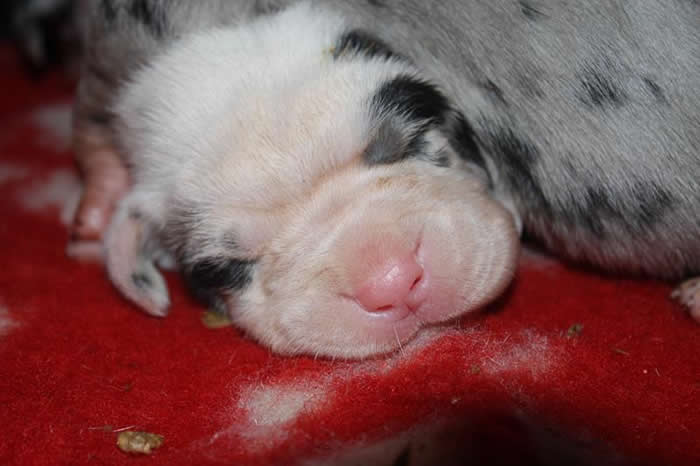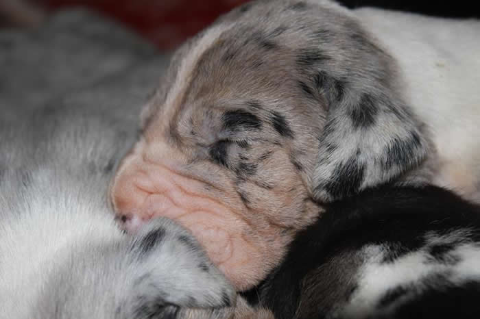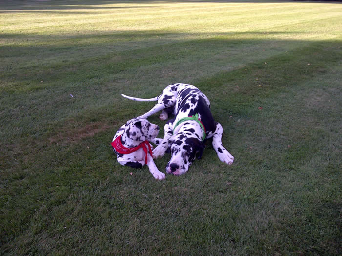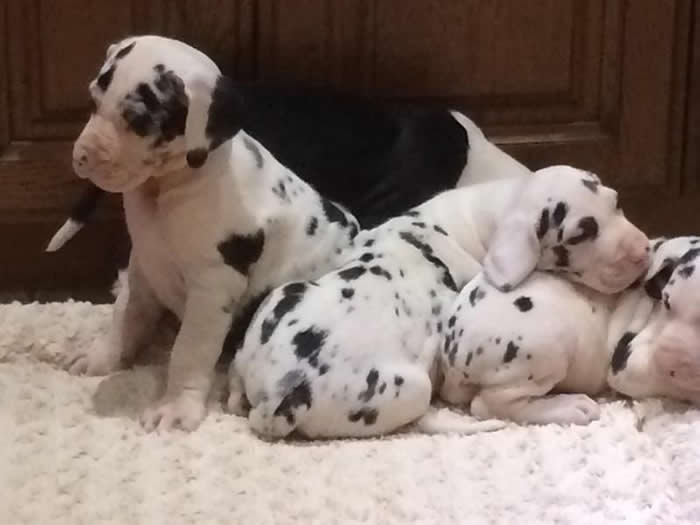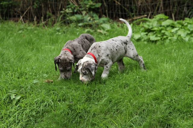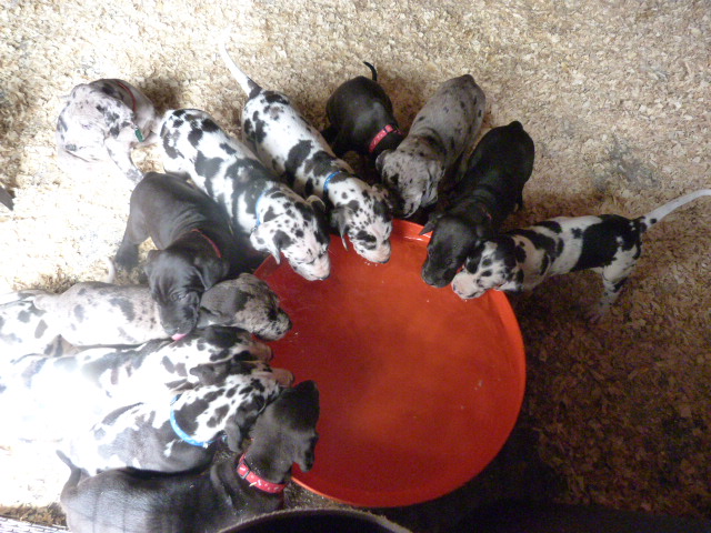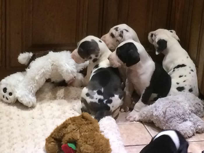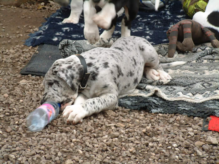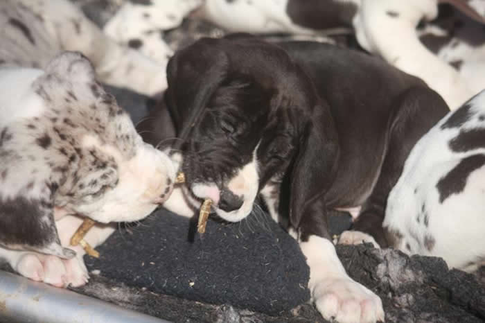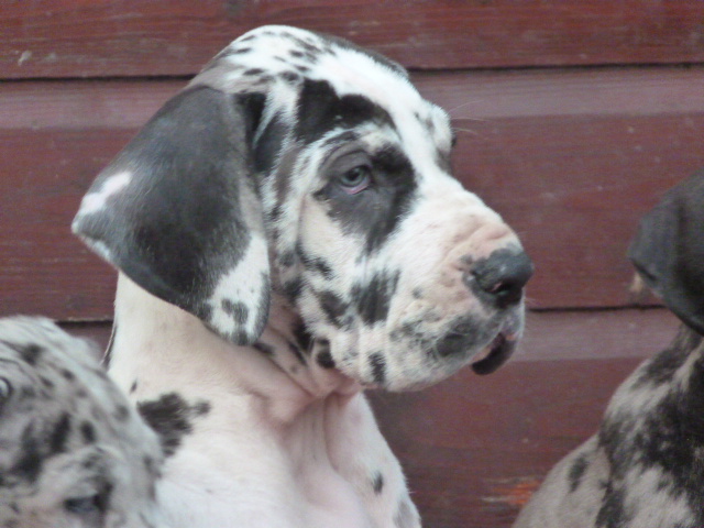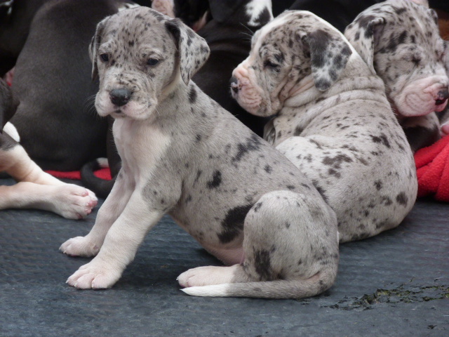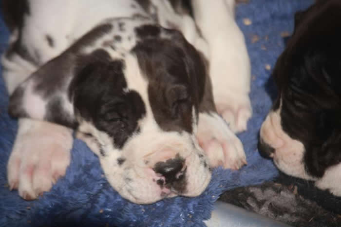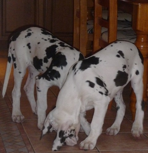 at 12 weeks old (shown here with a pretty 9 week old harlequin girl sired by Ravendane Pole Position - Bob)